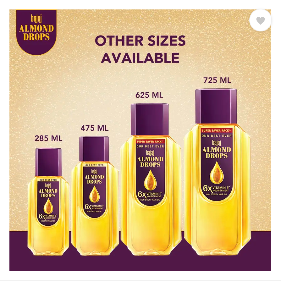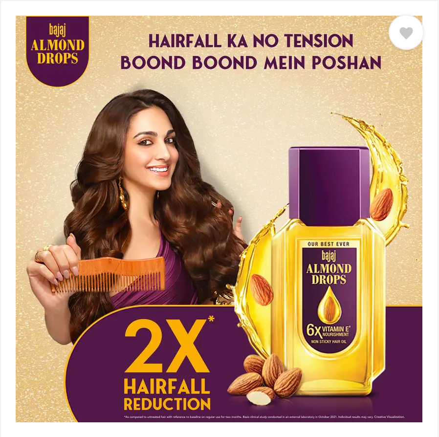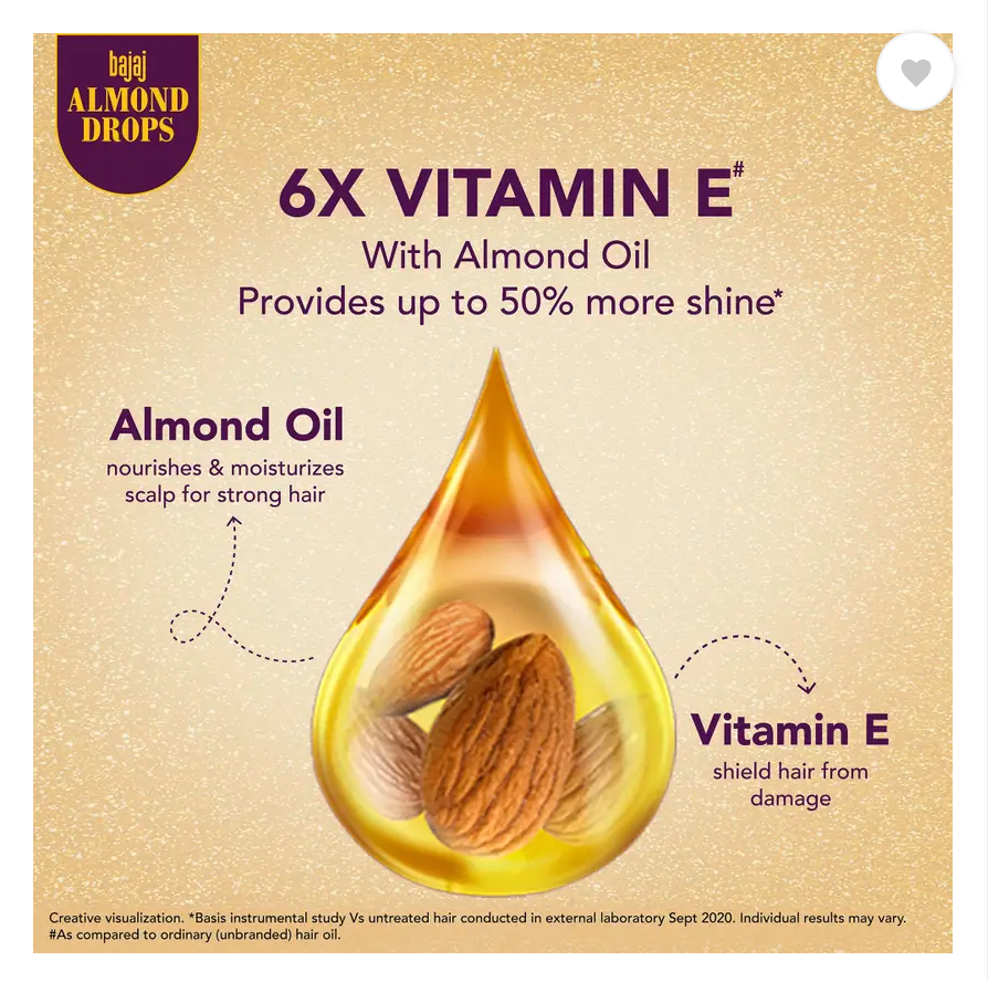 style your hair any way you want without the fear of hair fall, as Bajaj Almond Drops hair oil has got your back! Bajaj Almond Oil can reduce hair fall by up to 79%*, strengthen hair, and make them up to 50% more shiny! The new and improved Bajaj Almond Drops Hair Oil is enriched with 6x Vitamin E^ & Almond Oil to help you get the shiny, strong hair you’ve always wanted. This oil for hair fall reduction works to strengthen and nourish your hair and, as a result, reducing hair fall due to breakage. It is light, non-sticky and the perfect hair growth solution. So don’t wait to flaunt beautiful hair, that is strong inside and shiny outside, with new hairstyles every day! ^Compared to ordinary (unbranded) hair oil. As per IMRB Kantar World panel 2018-19 data. *Hair fall due to breakage, basis instrumental study conducted on August 2019 in an independent lab. Independent results may vary.