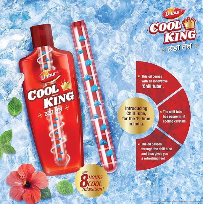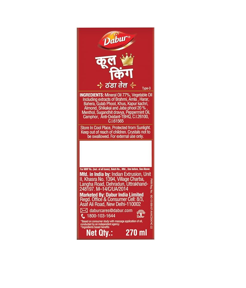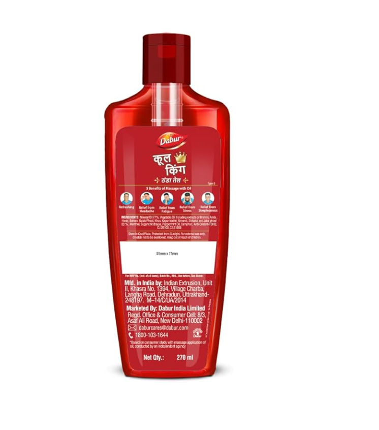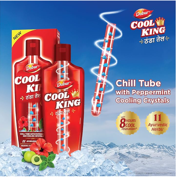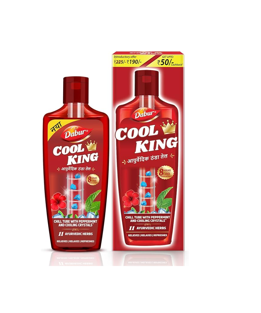 Dabur Cool King Thanda Tel is a cooling herbal hair oil enriched with menthol and Ayurvedic ingredients that help relieve stress, headaches, and fatigue while keeping the scalp cool and refreshed. Promotes relaxation and healthy hair with regular use.