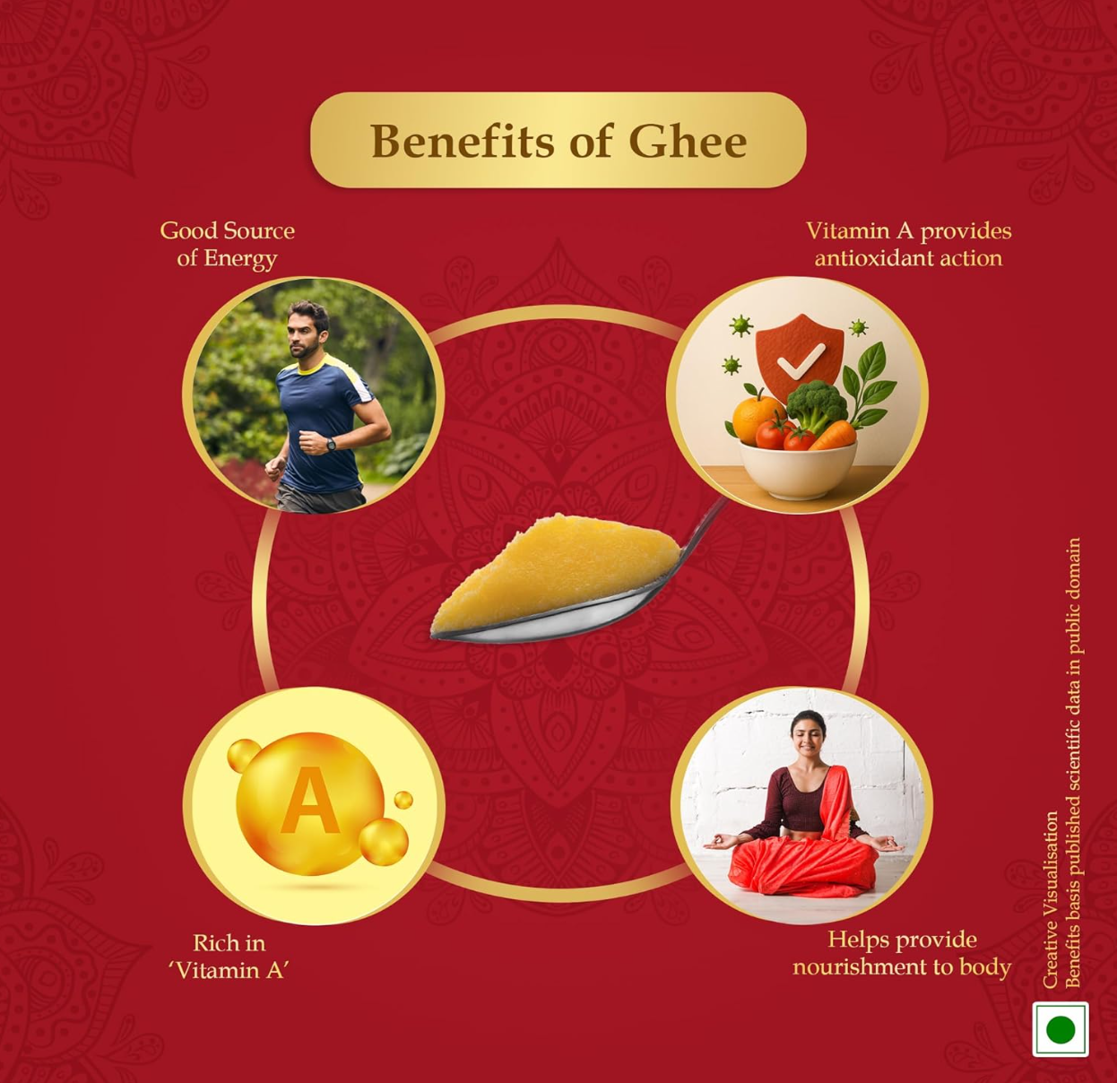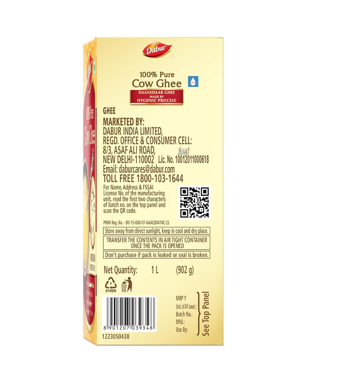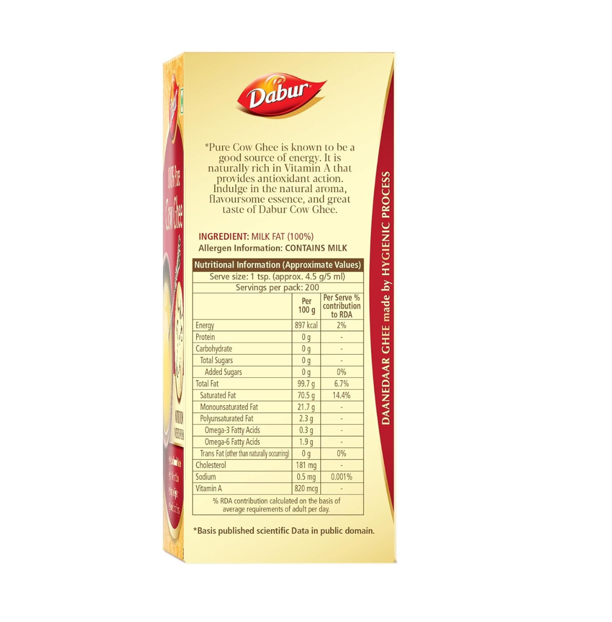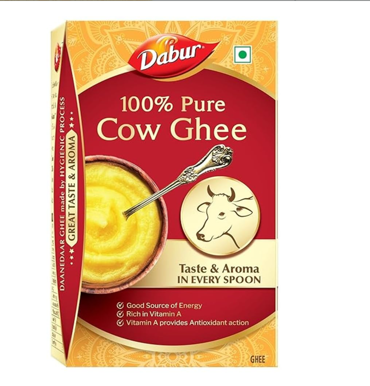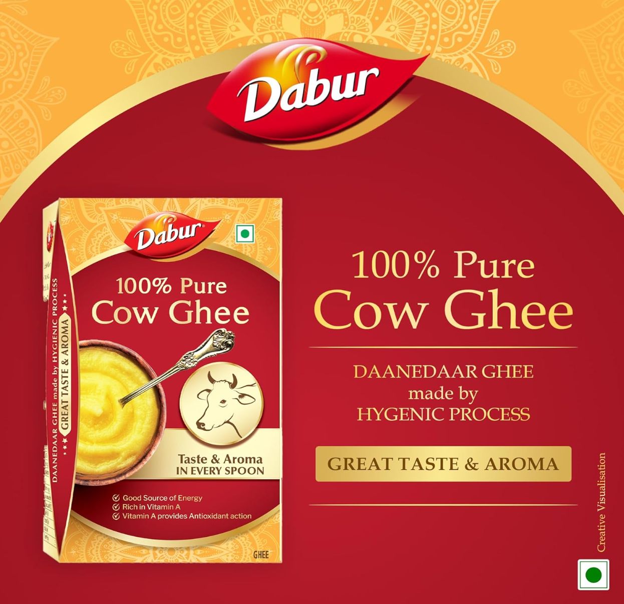 Dabur Cow Ghee is made from 100% pure cow’s milk, offering a rich aroma, golden texture, and authentic taste. It’s ideal for cooking, frying, or traditional rituals, promoting better digestion, strength, and overall wellness.
