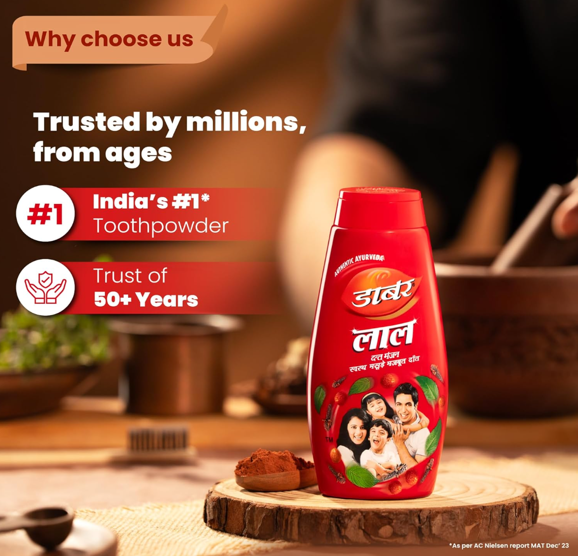 Dabur Lal Dant Manjan is an Ayurvedic tooth powder formulated with trusted natural ingredients like clove, mint, and pudina to help strengthen teeth and gums. It effectively fights germs, prevents cavities, and keeps breath fresh, ensuring strong teeth and healthy gums naturally.