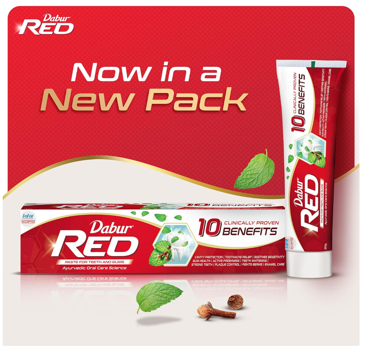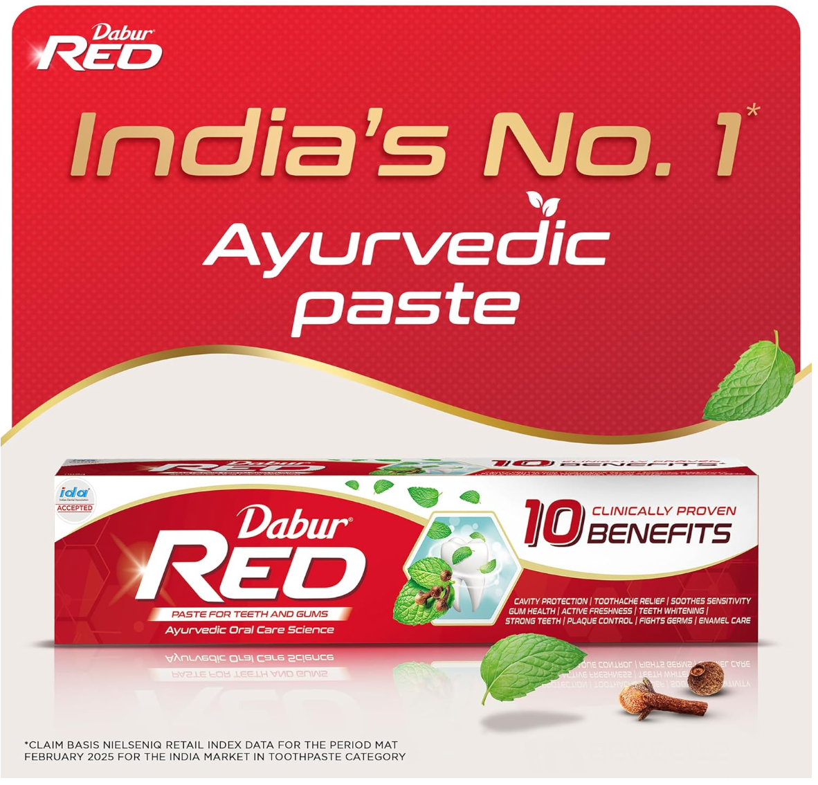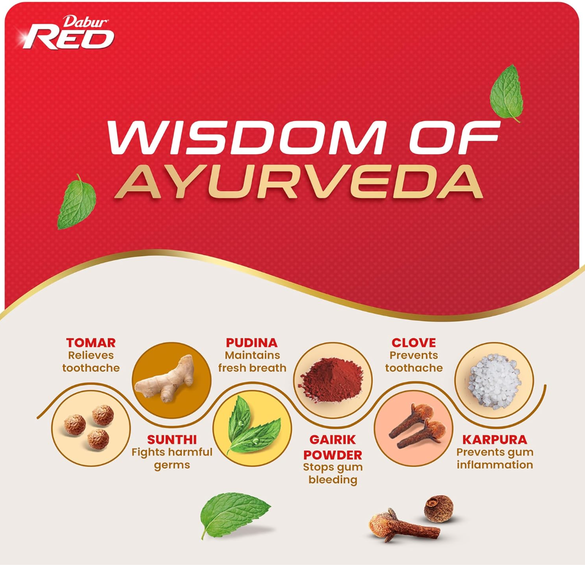 Dabur Red Toothpaste is a unique Ayurvedic formula made with clove, mint, and other natural herbs to provide strong teeth and healthy gums. It helps fight germs, prevent cavities, and ensures fresh breath and complete oral care every day.