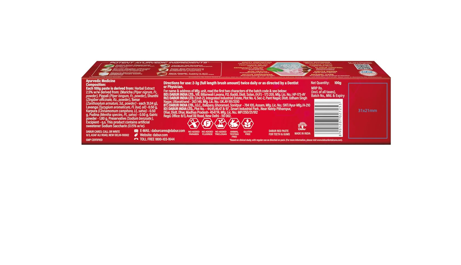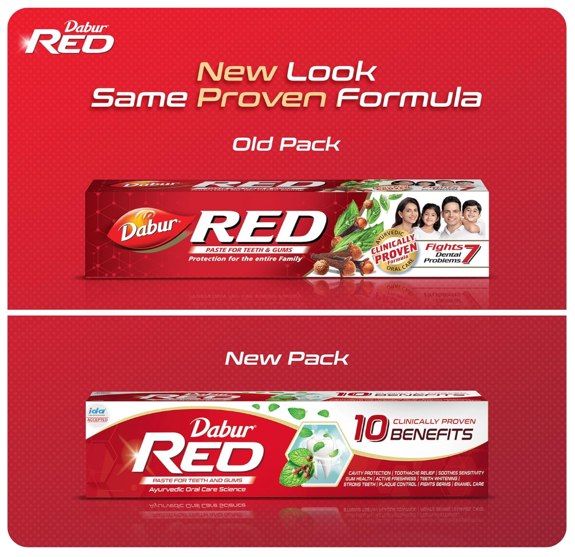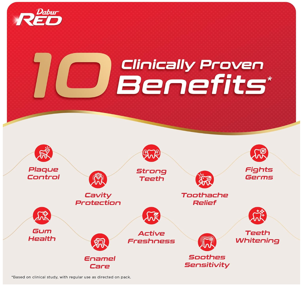 Dabur Red Toothpaste is a unique Ayurvedic formula made with clove, mint, and other natural herbs to provide strong teeth and healthy gums. It helps fight germs, prevent cavities, and ensures fresh breath and complete oral care every day.
