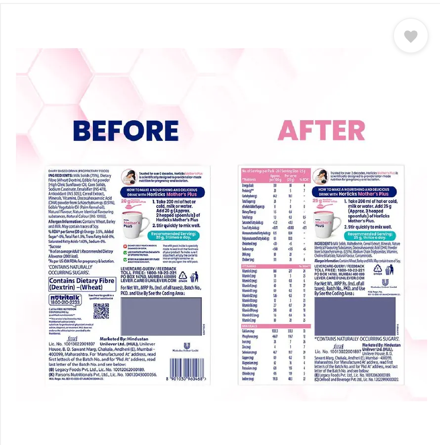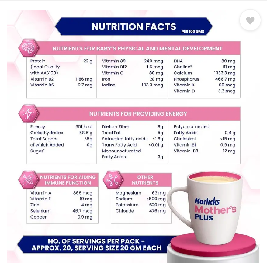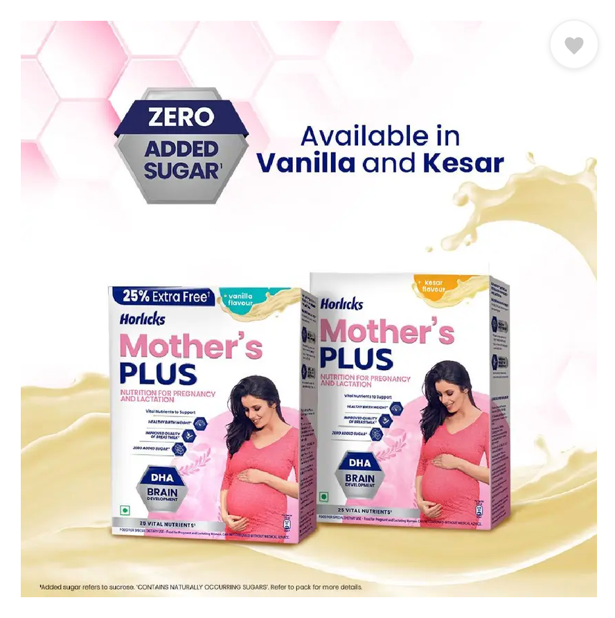 The right nutrition during pregnancy is important for the mother’s strength and baby’s growth and the mother’s daily diet alone may sometimes not be sufficient.’Trusted for over 2 decades, this scientifically designed Nutrition drink provides tailor-made nutrition for pregnancy and lactation. Horlicks Mother’s Plus earlier known as Mother’s Horlicks provides protein, DHA & 25 Vital Nutrients that are essential for the Mother’s strength & baby’s physical & mental development. Horlicks Mother’s Plus contains micronutrients (Iron, Iodine, Folic Acid, Zinc, Magnesium, Vitamin A, B6, B12, Vitamin D and protein) that are known to support more nutritious birth weight. It contains DHA and Choline known to support Brain Development It also contains 50% RDAs of Immunity supporting nutrients like Vitamin A, E, B6 and Selenium. In the first 6 months, a newborn baby solely depends on the mother’s milk for nutrition*. Horlicks mother’s Plus has micronutrients like Vitamins B1, B2, B6, B12, A, D, Iodine, and Selenium that help improve the quality of breast milk. Horlicks Mother’s Plus is a nutritional beverage to be consumed as a part of daily diet. *exclusively breastfed. ^In 3 serves. Added sugar refers to Sucrose. CONTAINS NATURALLY OCCURRING SUGARS.