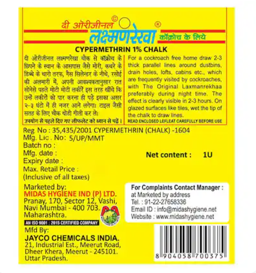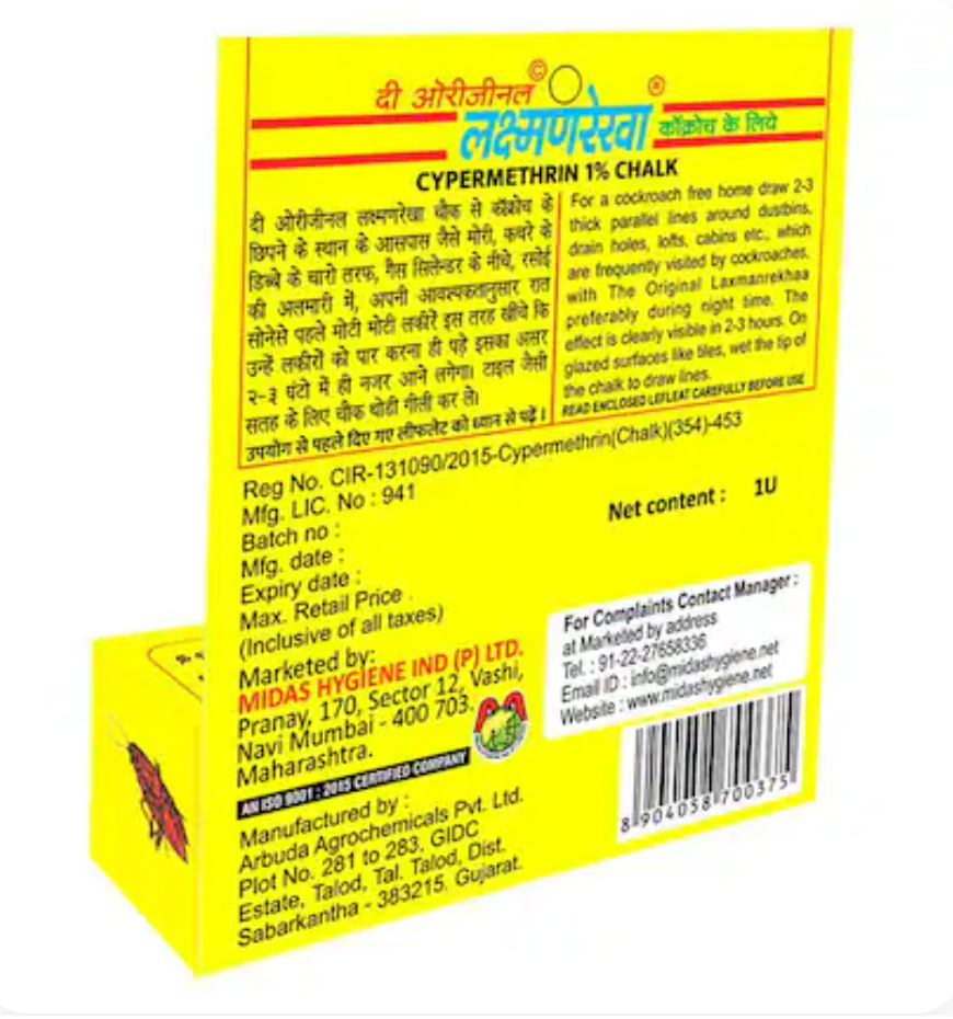 Laxman Rekhaa Insecticide Chalk is an effective insect-killing solution used to eliminate cockroaches, ants, and other crawling insects. Simply draw a line in infested areas — the chalk’s active ingredients provide long-lasting protection by killing insects on contact and preventing re-entry.