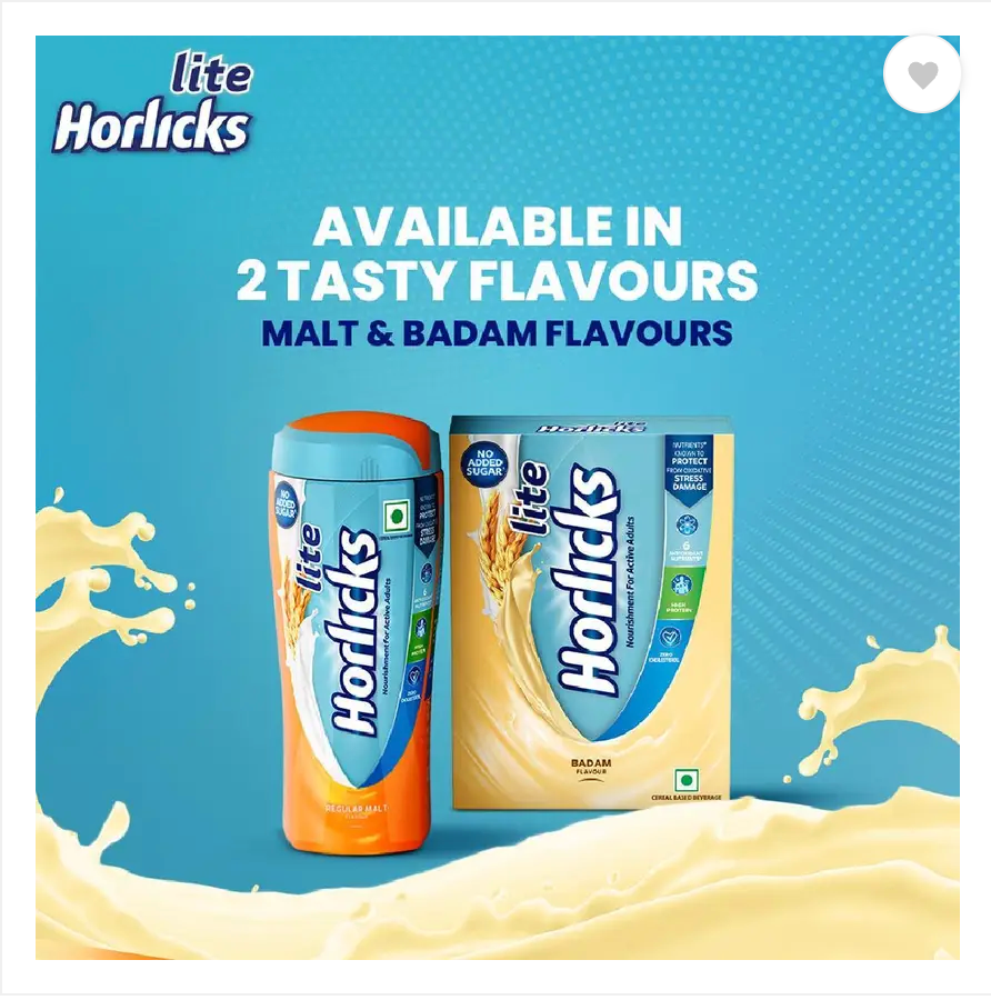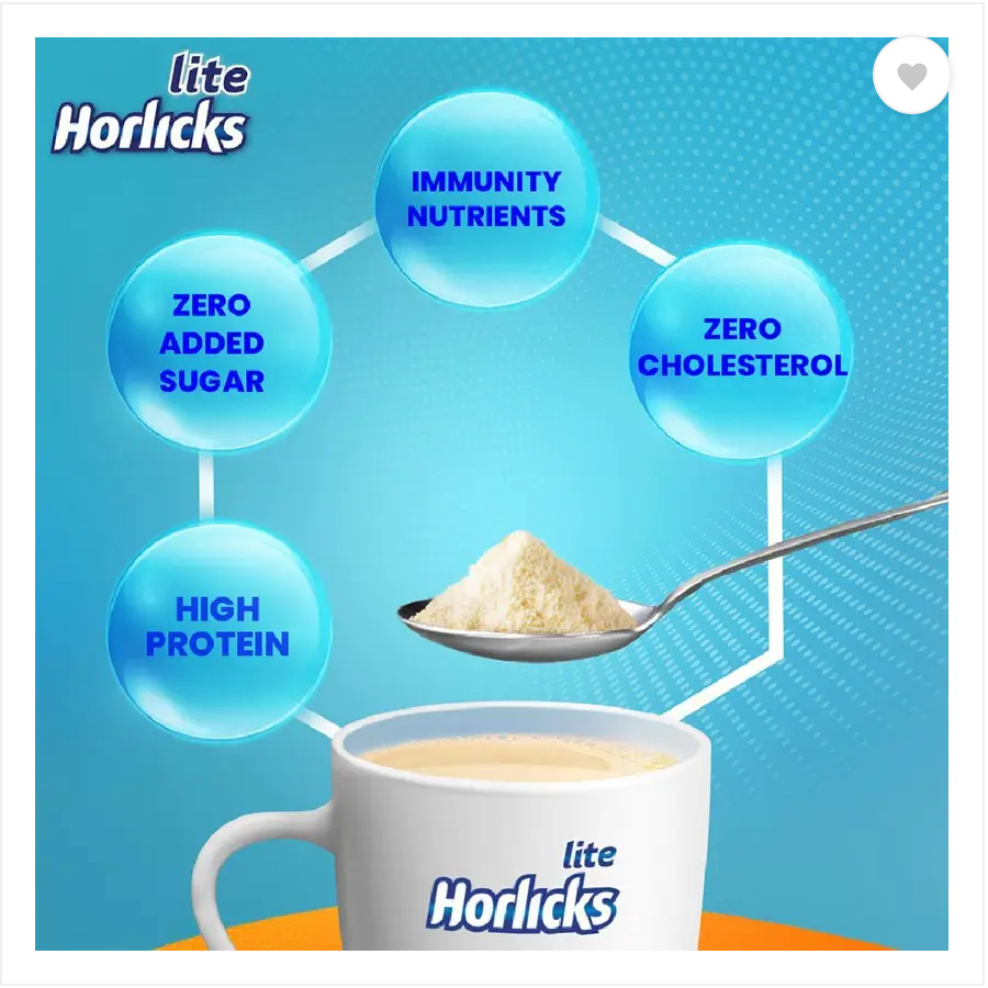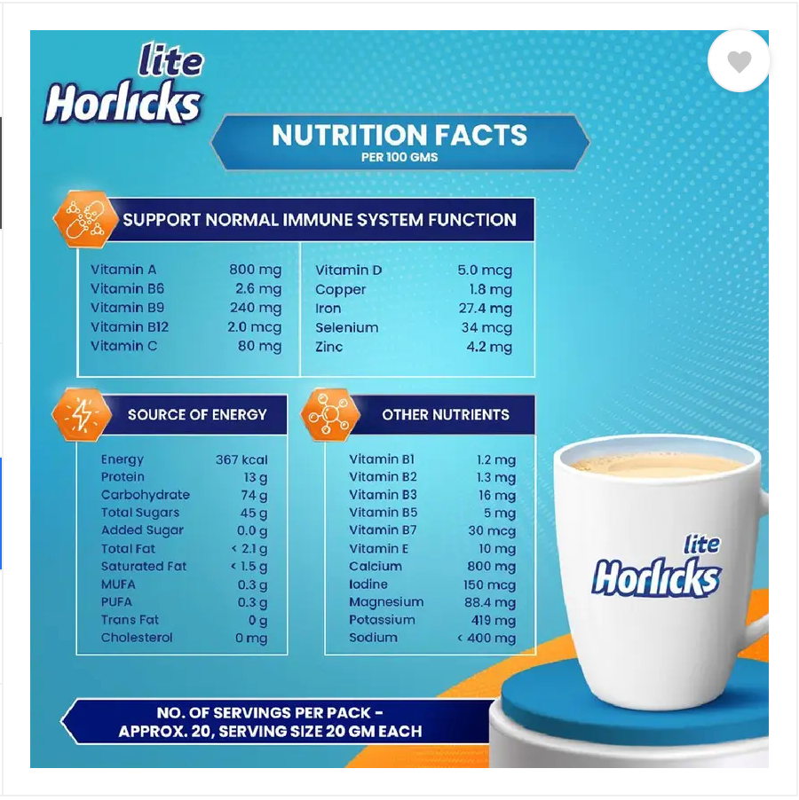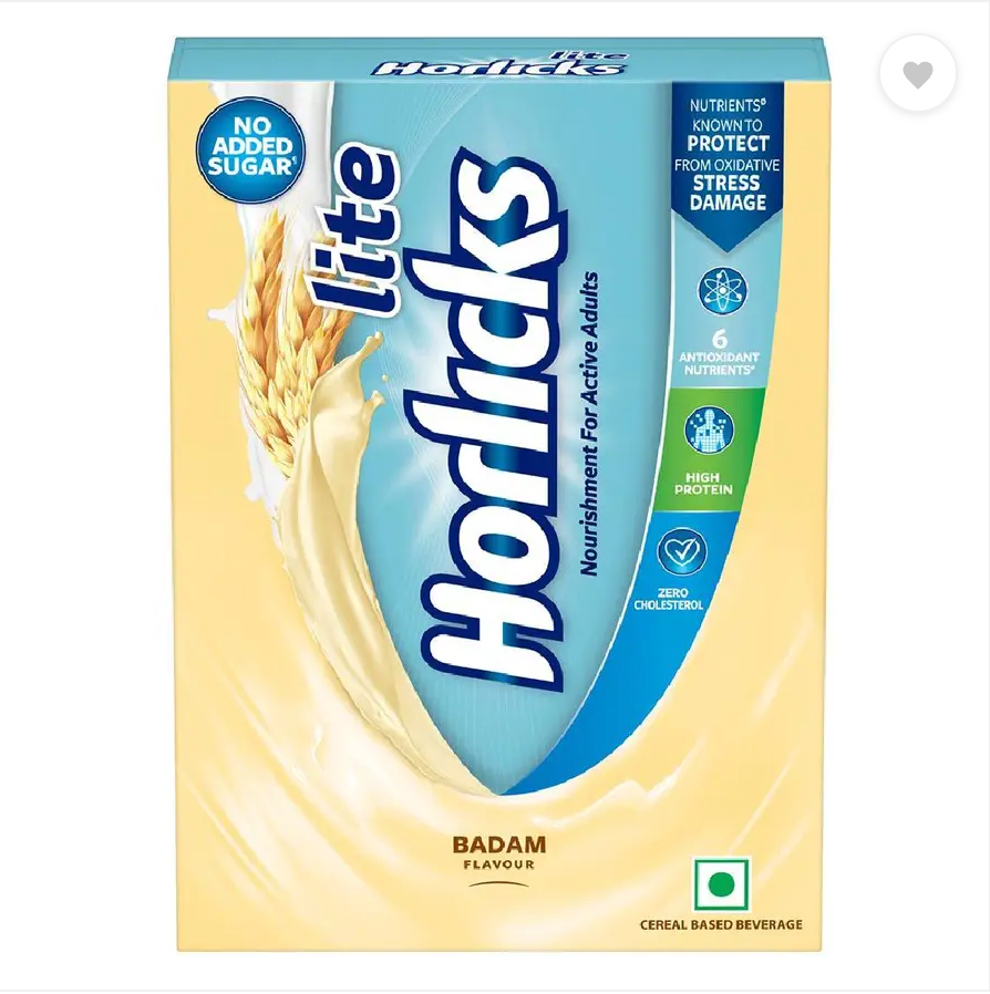 Horlicks Lite is a specialized adult nutrittion drink that caters to the unique nutritional requirements of active adults aged 35 and above. Horlicks Lite with no added sugar contains high-quality protein that helps in cell maintenance and repair, which is essential for maintaining a healthy body. Moreover, Horlicks Lite is free from added sugars and cholesterol, making it a perfect fit for older adults. About Horlicks Lite: � Nutrition designed for Active Adults �Horlicks adult contains essential nutrients like Vitamin C, Vitamin D, and Zinc that are known to support the optimal functioning of the immune system, promoting a healthy body. � Lite Horlicks is with no added sugar. � It contains six antioxidant nutrients, like Vitamin C, Vitamin E, Vitamin B2, Zinc, Selenium, and Copper, that protect cells from oxidative stress, ensuring the bodys overall well-being. Horlicks Lite is a nutrition drink for adults is designed to support the healthy lifestyle of active adults and provides a maximum shelf life of 12 months. Add three heaped teaspoonfuls (25g) of the powder to 200ml of cold or hot milk or water to prepare your nourishing Horlicks Lite drink. Stir quickly to mix well and enjoy Horlicks Lite. It is available in 2 tasty flavours � Regular Malt & Badam