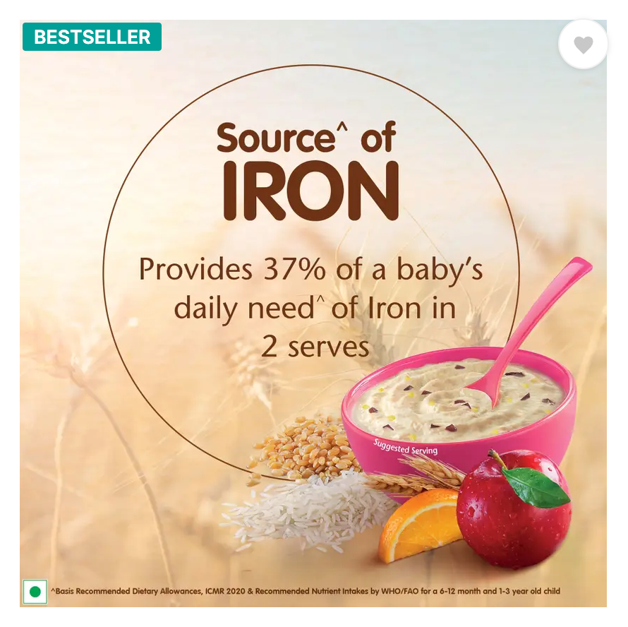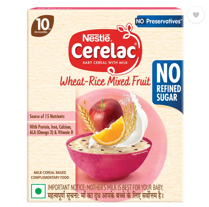 Nestle CERELAC Multigrain & Fruits is a complementary baby food for infants from 12 to 24 months. 2 serves of CERELAC Multigrain & Fruits Cereal provide 37% of a baby’s daily need of iron. It is also a source of 14 important nutrients including vitamins and minerals. This baby food cereal is rich in protein and packed with the goodness of cereal, milk, and fruits. With 155 years of scientific expertise in infant nutrition, Nestle develops infant nutrition products backed by evolving science and research. Innovation has been at the heart of Nestle since its beginning. Storage Instructions: After opening the pack, the contents should immediately be transferred to an empty, clean, dry and airtight container. After each use, replace lid tightly & store in a cool & dry place. Important Notice: Mother’s milk is best for your baby. Basic Recommended Dietary Allowance, ICMR 2020 & Recommended Nutrient Intake by WHO/FAO for a 1-3 year old child.Safety Warnings: Infant food should be used only on the advice of a health worker as to the need for its use and the proper method of its use. Infant food is not the sole source of nourishment for an infant. Use prepared feed within half an hour otherwise microbial deterioration may set in. Discard unused feed.