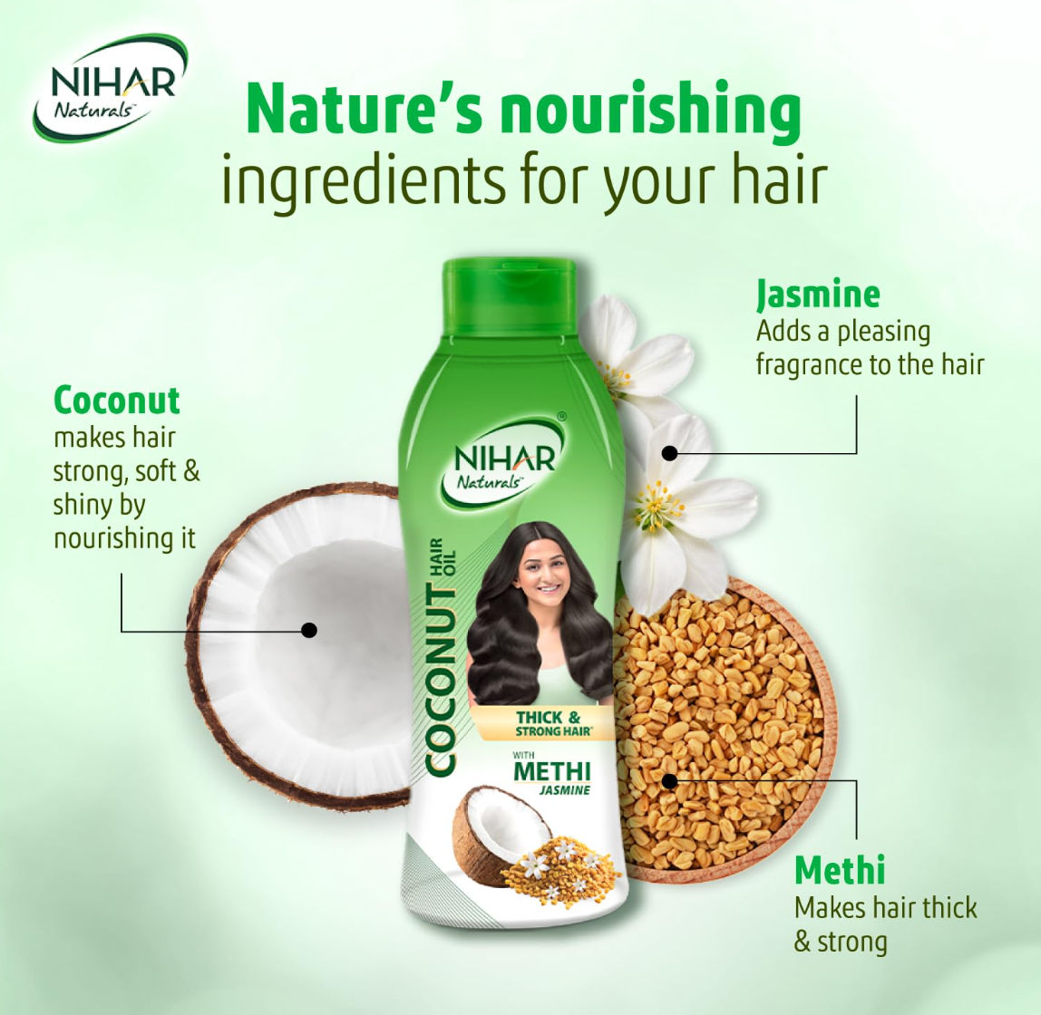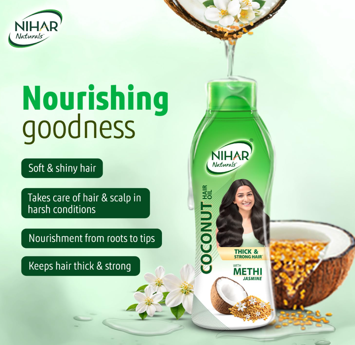Nihar Natural Non-Sticky Coconut Hair Oil is enriched with pure coconut oil and natural extracts that nourish hair from root to tip. Its light, non-sticky formula keeps hair soft, shiny, and manageable, providing deep nourishment without any greasiness.