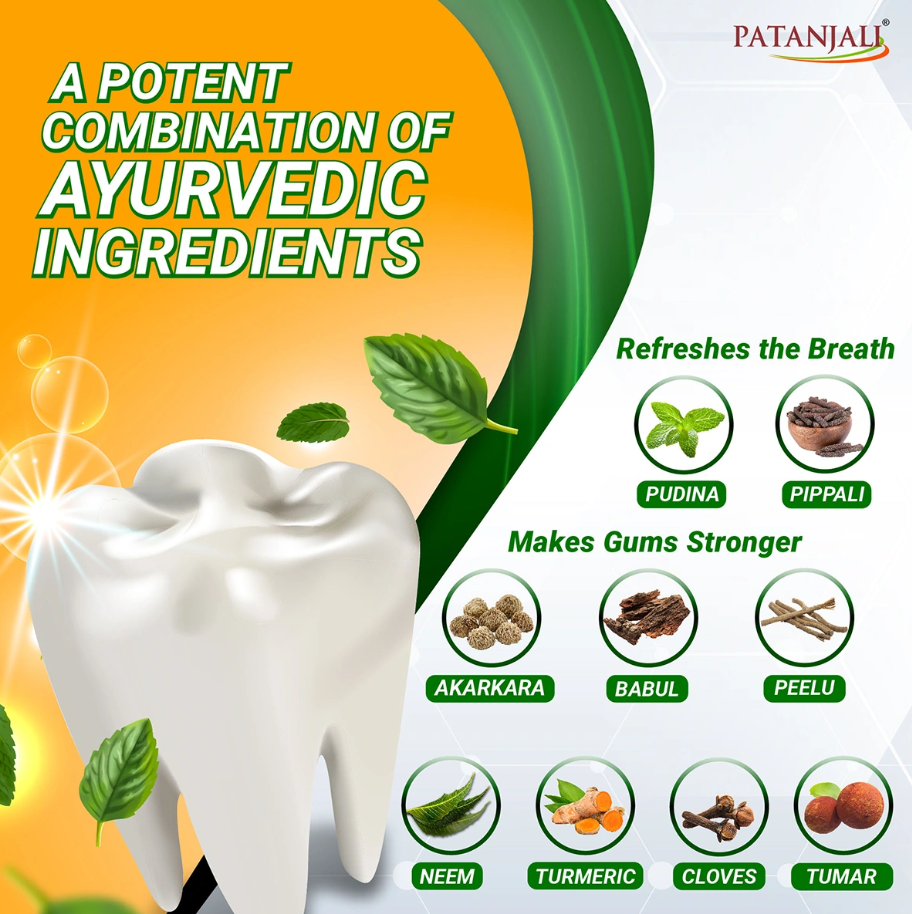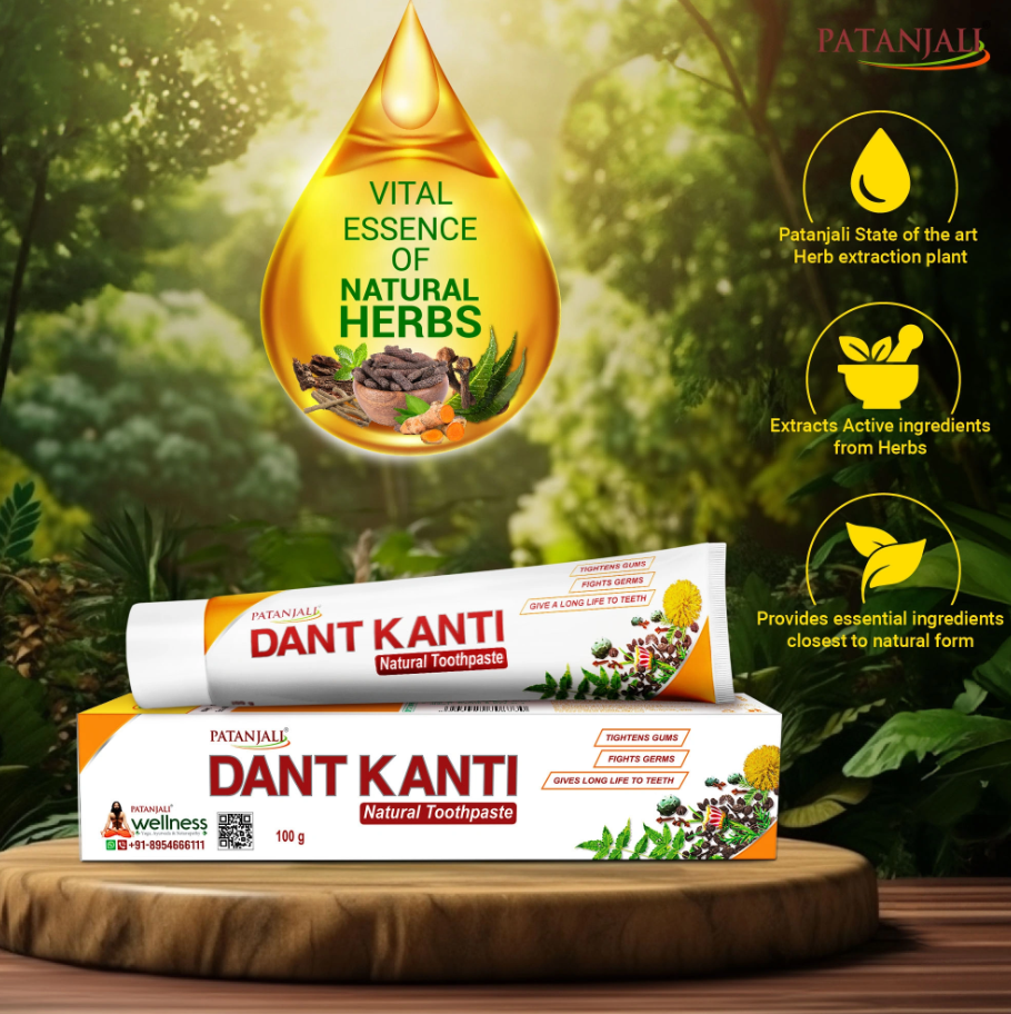 Patanjali Dant Kanti Toothpaste is an Ayurvedic oral care formula enriched with neem, clove, babool, and other natural herbs. It helps strengthen gums, prevent cavities, fight bad breath, and promote strong, healthy teeth with daily use.